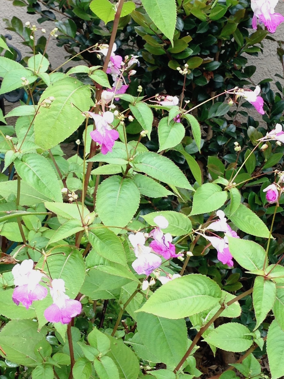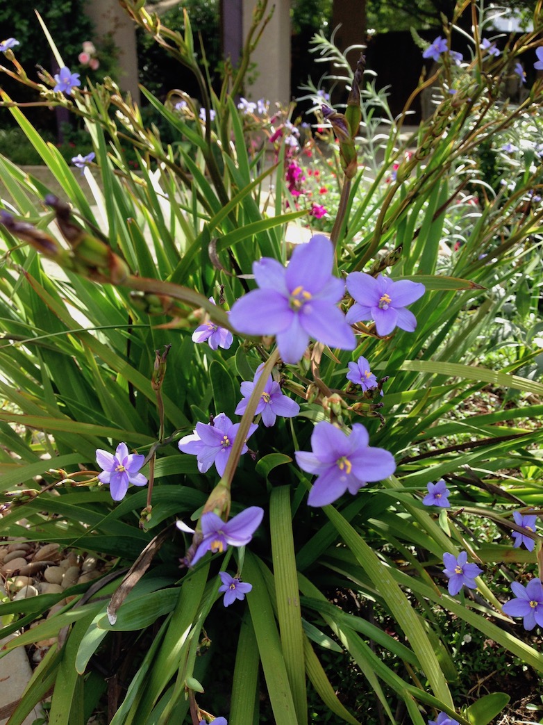 Since any post covering all the salvias I would like to introduce you to would have to be book length I am going to focus today on a group called by academically minded plantsmen “the greggii microphylla complex”. This is a confusing group of species which includes Salvia greggii, S. microphylla, S. x jamensis (a naturally occurring hybrid of the first two) and several others. There are many series of cultivars bred from various combinations of these species. A few examples found recently in my retail haunts include selections from the Heatwave, Mesa and Western Dancer series. These names commonly appear as part of the cultivar name although whether they are marked as greggii or microphylla is somewhat less consistent from grower to grower. These are not the showiest nor most refined members of their clan but, in general, plants in this complex are hardy, rugged perennials with twiggy stems, small fragrant leaves with their flowers held slightly above the foliage on slender stems. Salvia ‘Mesa Azure’ was my introduction to these shrubby salvias when I dug in a few 4″ pots in for color in the spring of 2010. I added ‘Mesa Rose’ and ‘Mesa Purple’ to my southern exposure front garden at the same time but ‘Mesa Azure’ remains my enduring favorite. Just by luck of the draw the other two colors ended up in a bed now dominated by a 20′ tall Raywood Ash (planted as a 15 gallon tree in 2010) and have lost most of their sun. They are still lovely but flower somewhat less vigorously than ‘Mesa Azure’ which has grown in full sun with minimal water for lo these many years and only gets better every year. I force it to rest most years by trimming it back in late November. In mild winters it has burst back into bloom by late January and blooms on and on. The flowers are more purple than the name would suggest and they they tend to open a lighter lavender then age to a bit darker hue.Likewise new foliage is a lighter, brighter green before it hardens off a bit. Pictured below is the most mature of the Salvia ‘Mesa Azure’ plants I adore and two photos showing the interesting flower color variation.