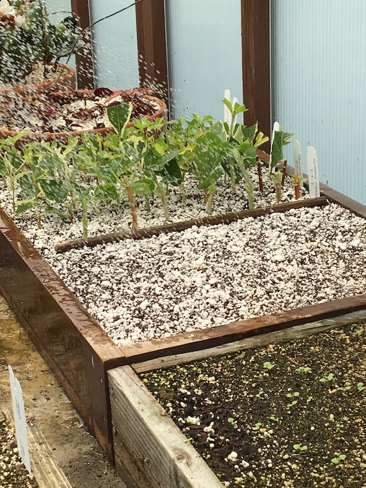 We stop outside the propagation house to see what is hanging out in the cold frames. Cuttings which have rooted well are potted up (usually to 4″ pots) and moved outside to acclimate. There are a number of cold frames throughout the ‘working’ areas of Filoli and at any given time they contain a mixture of potted up rooted cuttings, divisions and grown out plants waiting to be switched out in the display areas or bound for the retail shop.