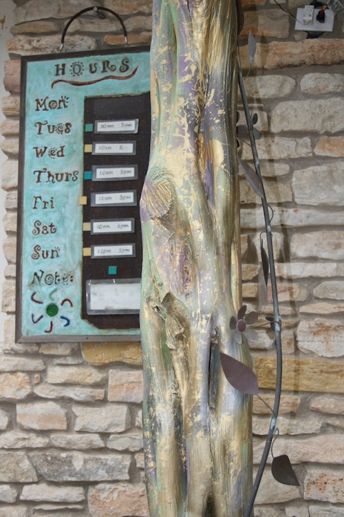 Irene and I chat about mutual garden concerns–woefully inconsistent rainfall et al–and I get the sense Sol’stice offers this mom the great blessing of combining the things she loves most–her son, art and gardening–into a very comfortable life/work existence. I entered through the garden but left through the art gallery and could not help but admire the natural wood posts holding up the door overhang and their whimsical adornments.